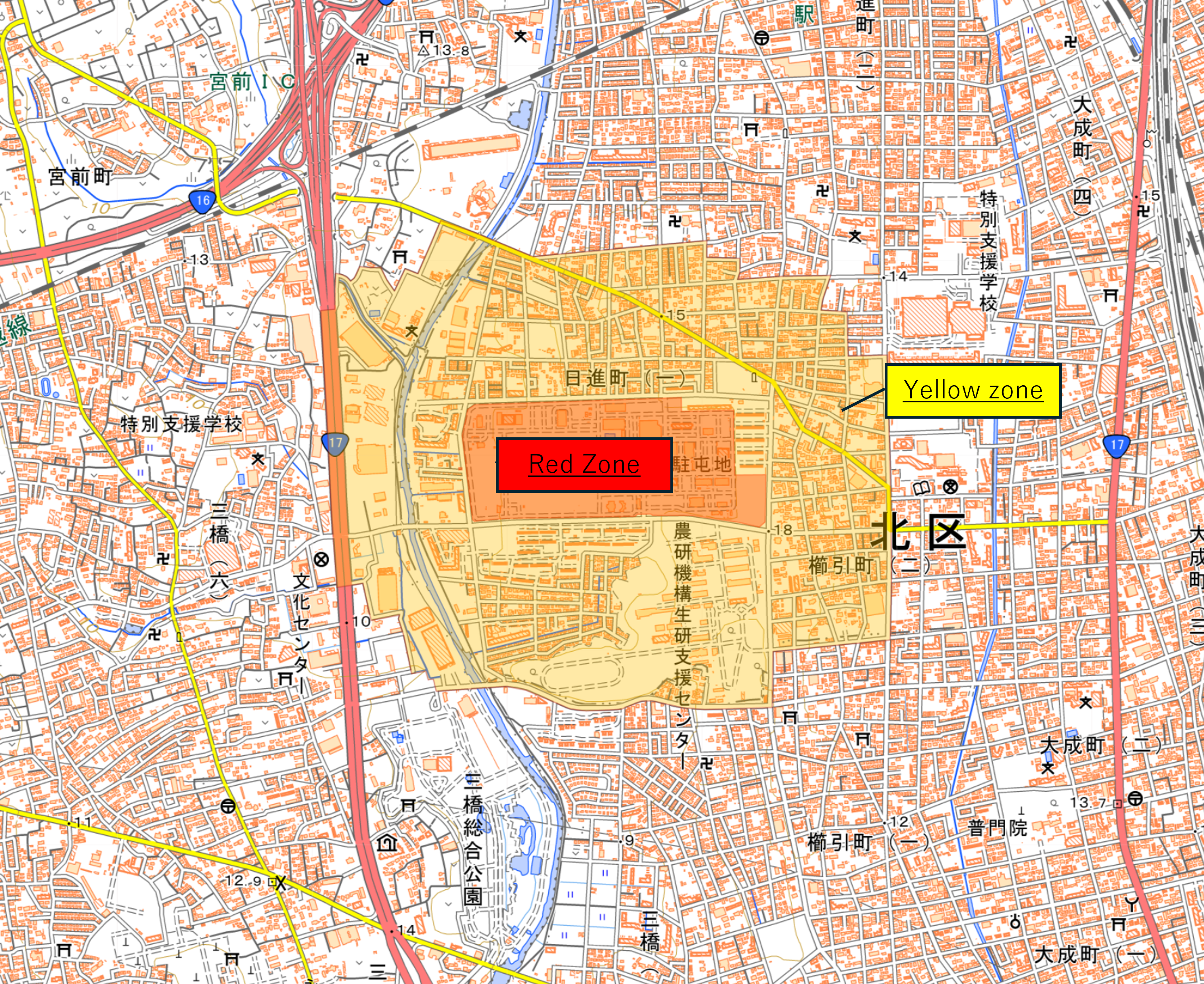 下図のオレンジと黄色のハッチングしてるエリアはドローンの飛行が禁止されているエリアです。