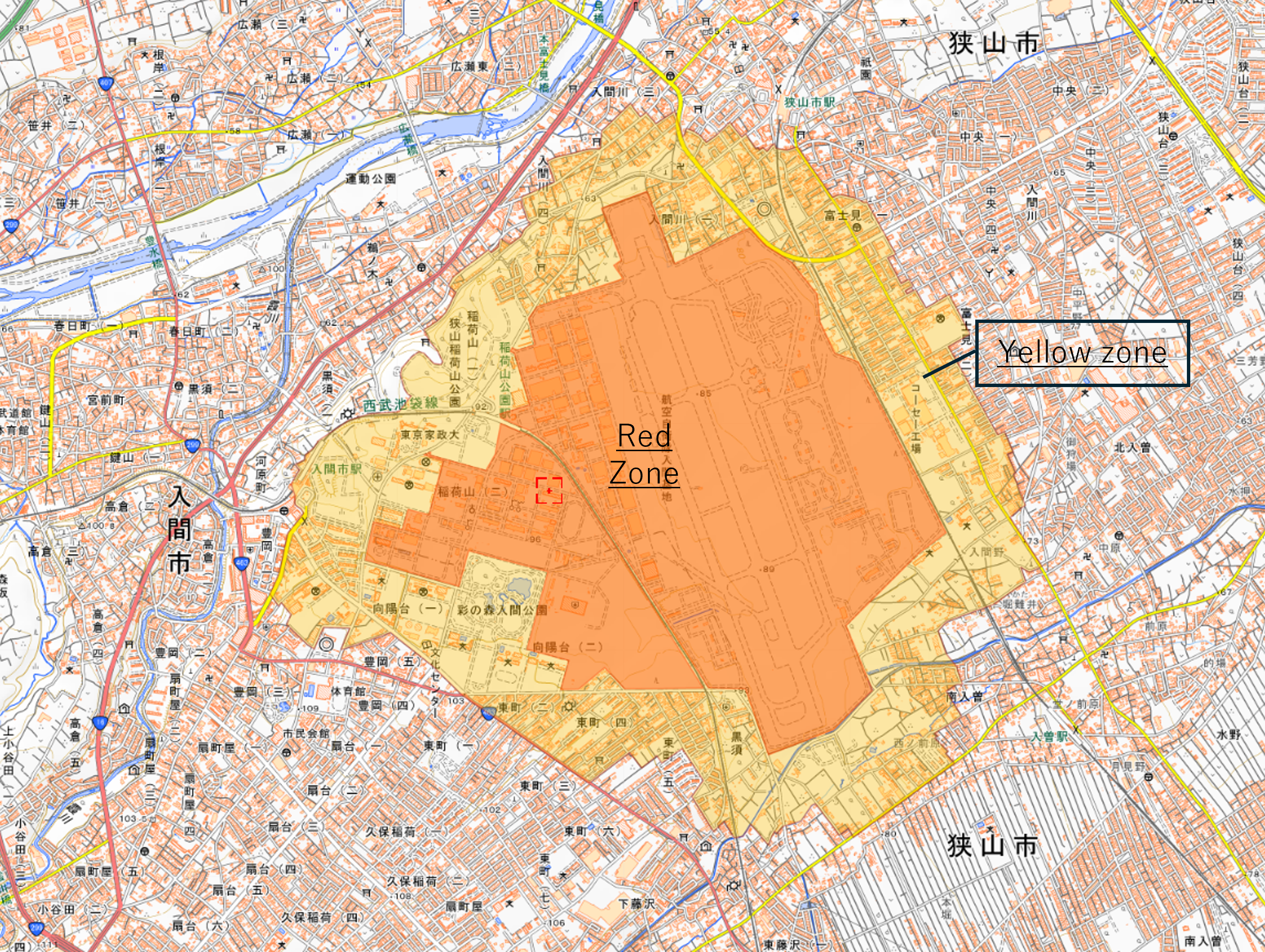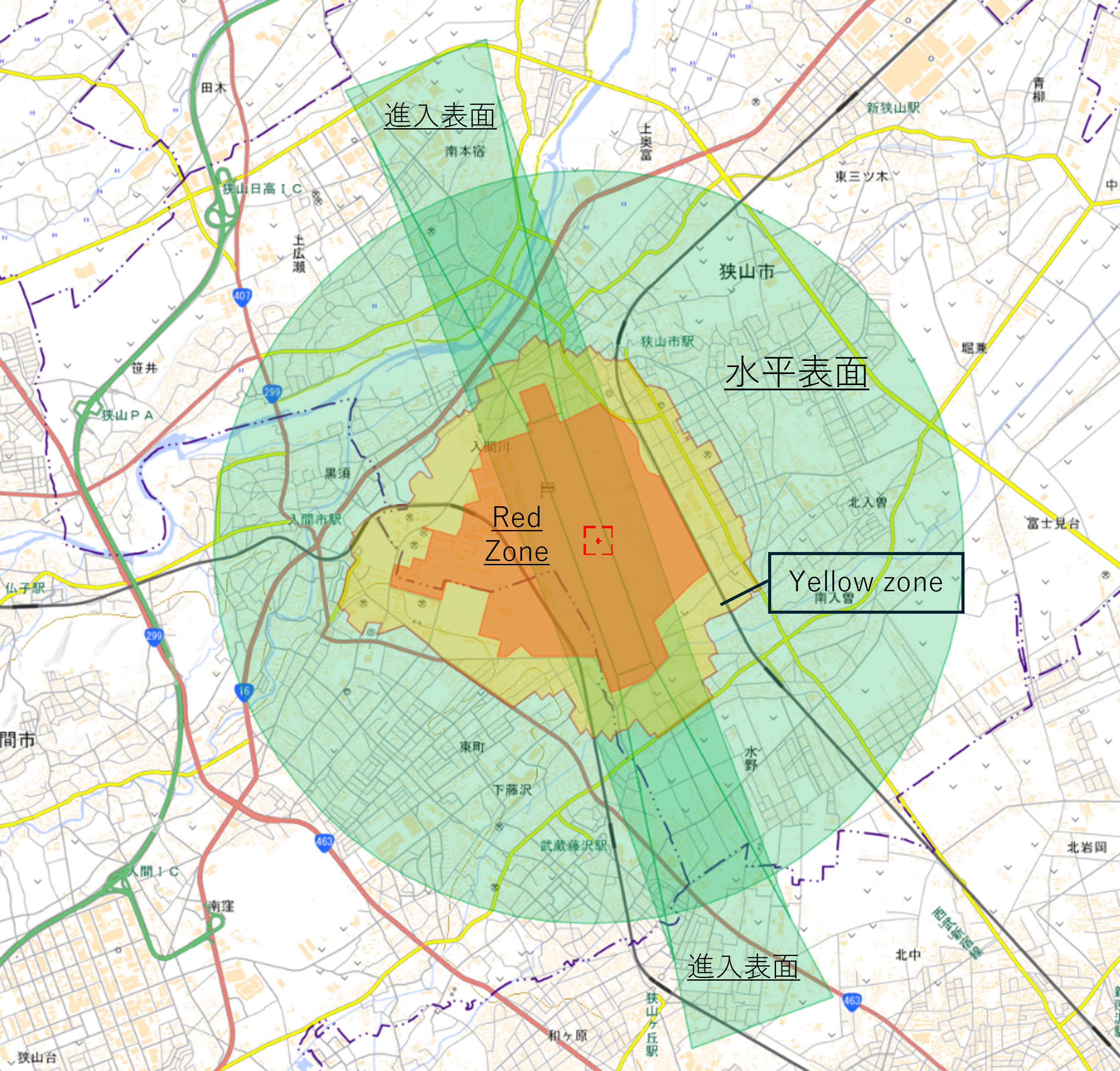 下図のオレンジと黄色のハッチングしてるエリアはドローンの飛行が禁止されているエリアです。