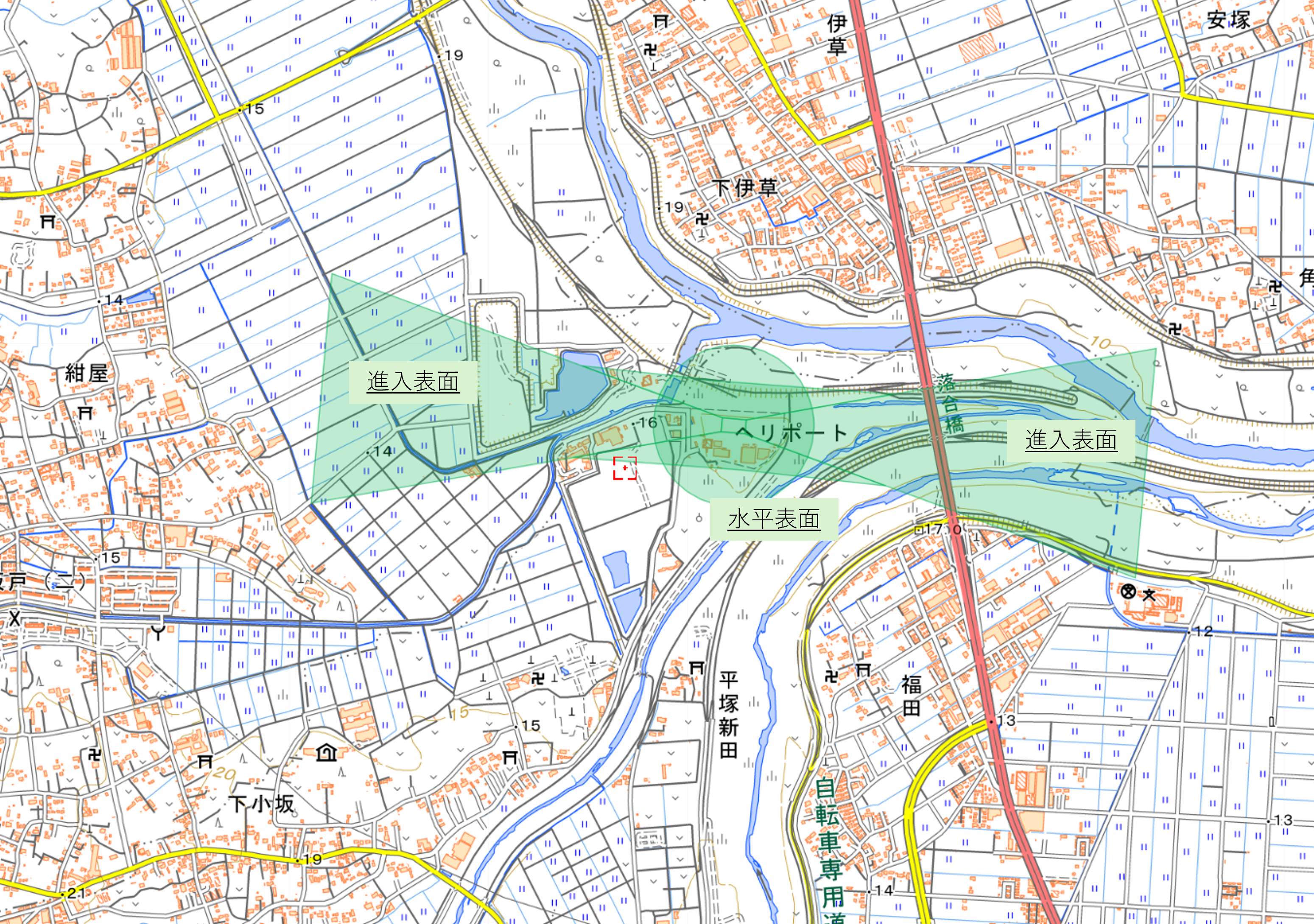 朝日川越ヘリポート周辺でドローンを飛行させる場合は、飛行場による航空法の制限を受けます。下図の緑色ハッチング部分の制限表面は、ドローンの飛行禁止エリアです。このエリアでドローンの飛行が必要な場合は、事前に調整し、航空局に調整結果を付して申請する必要があります。